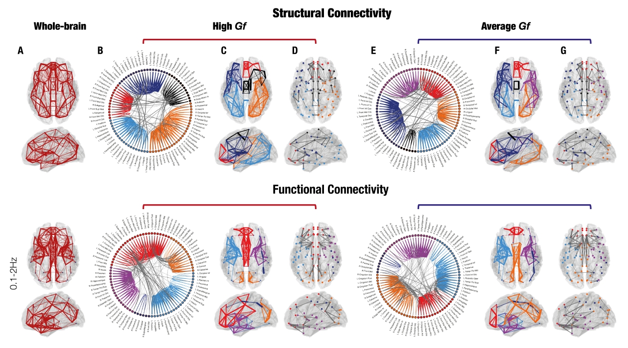 Computing graph theory measures on functional (from MEG resting state) and structural (from DTI) connectivity networks, I discovered that highly versus average intelligent individuals (high versus average Gf) presented a higher level of integration of information across the whole-brain and a more efficient segregation of local brain subnetworks.